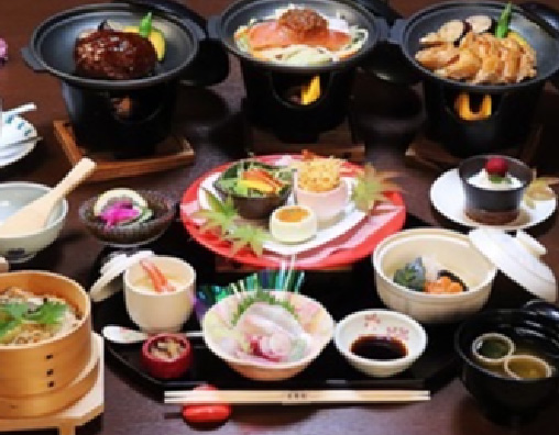 This is a restaurant found at nature-rich Mt. Shinobu in the heart of Fukushima City. The restaurant offers a satisfying lunch experience with heartfelt hospitality and carefully prepared dishes that put the fundamentals of Japanese cuisine first. Enjoy the main dish of your choice: hamburger steak with Japanese beef, miso teriyaki chicken, or white fish grilled with yuzu miso. The meal includes dessert and coffee or tea for a total of 12 items.